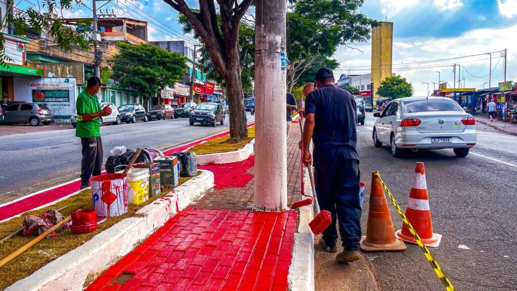 Esta ação faz parte do cronograma contínuo de manutenção urbana e incluiu, além da renovação da sinalização horizontal, a demarcação da área destinada à caminhada com pintura na cor vermelha. A medida amplia a visibilidade do espaço e contribui para a organização do fluxo entre veículos e pedestres.